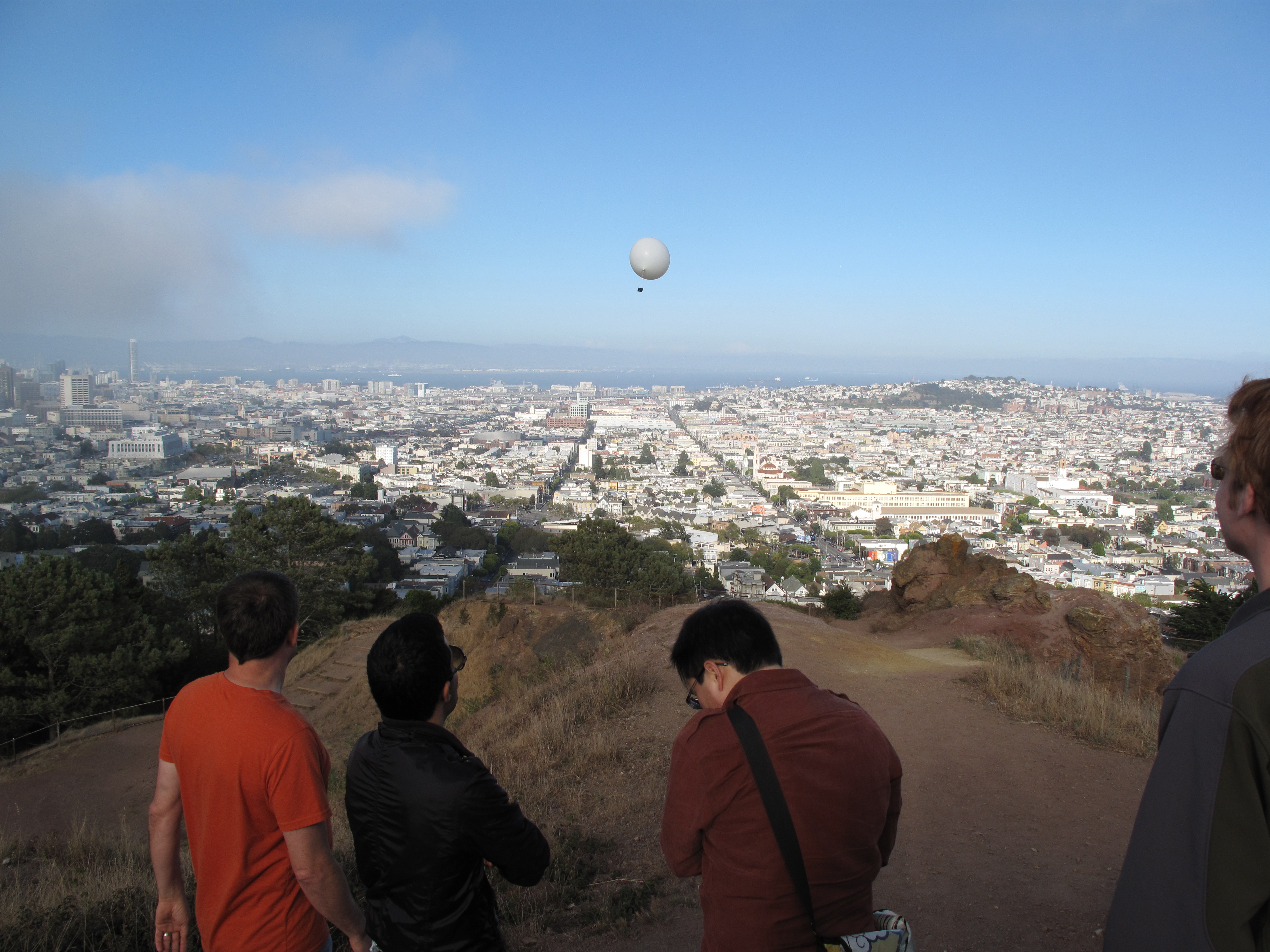 | Inflating the balloon at Corona Heights Park. The sun was starting to come down and the fog was starting to drift in. |