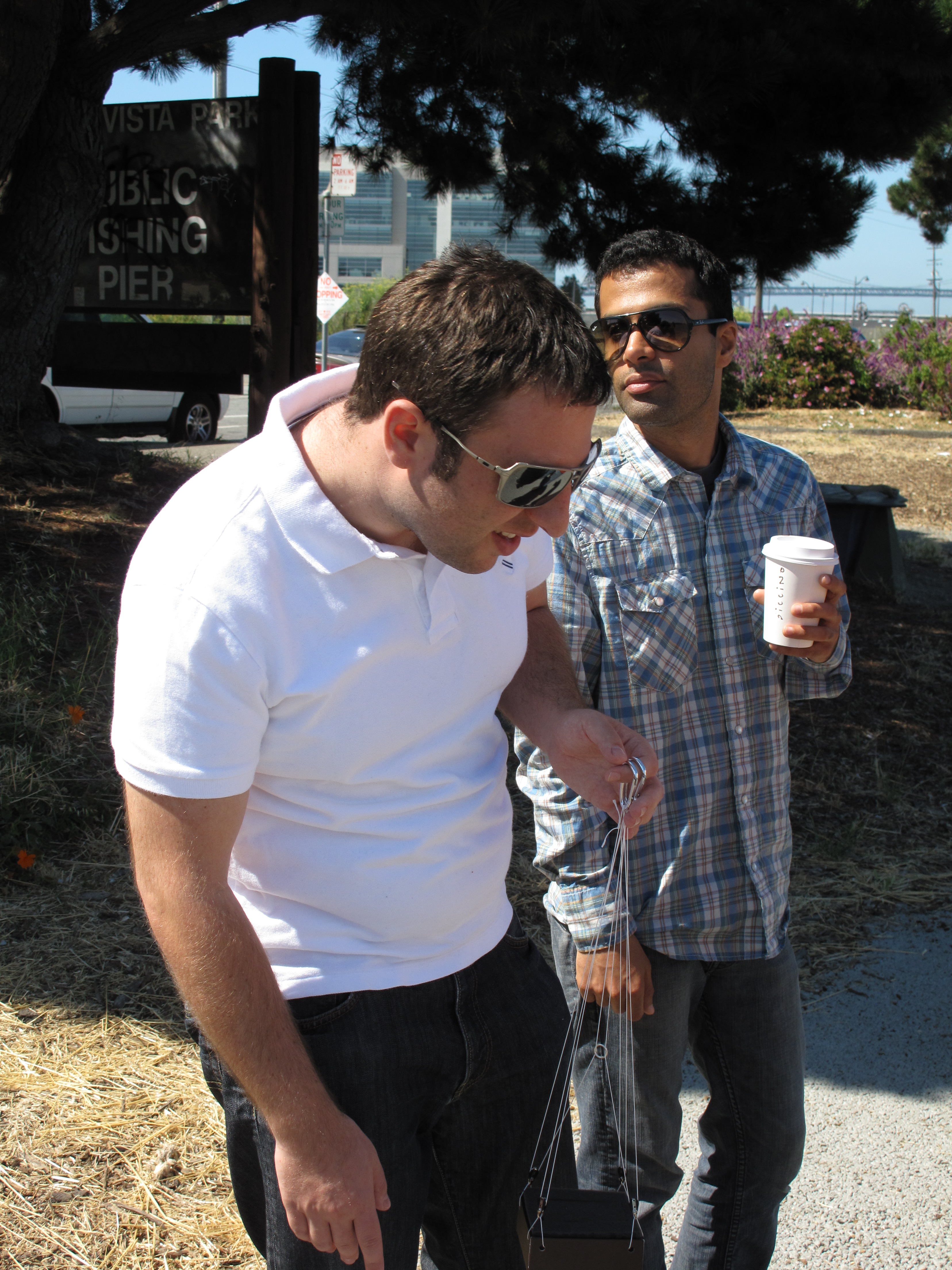 | Careful gondola attachment. At this point, the primary knot holding the cord to the balloon came undone. Whoops! Good thing we hadn't let go yet! |