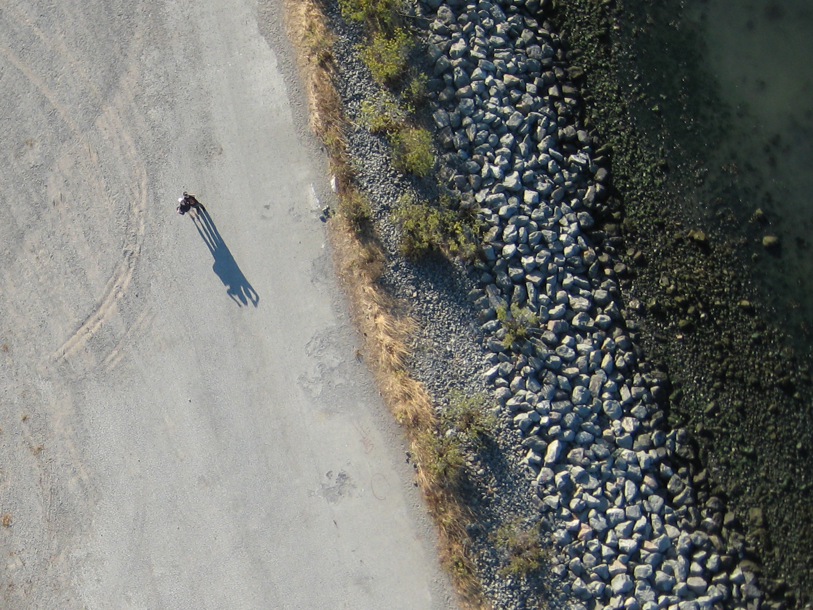Looking back at the gravel lot and Warm Water Cove park, you can just barely see our crew, and the tether line. |