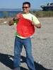 Simon with the uninflated Big Red Balloon. In red, a dead ringer for an enormous whoopee cushion! |
