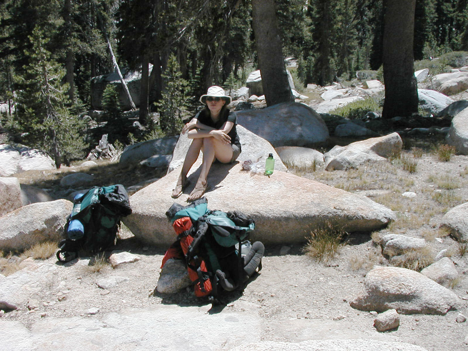 Lillian Lake Backpacking Trip (July 2002)You are here: Andrew Ho > Personal > Photos > 2002 Lillian Lake Hike In July of 2002, Holly and I and a handful of Tellme Network Operations folks took a camping trip to Lillian Lake, southeast of Yosemite. It was our first backpacking trip ever, and for me, the first time I had ever even slept outdoors in a tent. The trail we took was slightly over 12 miles total, starting at about 8,000 feet and going up to 10,000 feet at the lake. Mark Verber organized the trip, and you can read his trip journal for more general information about it. Todd put together some topographical maps. Bryan took some snazzier pictures, posted on his travel pages, starting at this set. I figured I would forget to pack something, given that this was my first time backpacking, and sure enough, halfway on our arduous and traffic-ridden drive up, I figured out that I had forgotten my hiking boots. Whoops! Holly and I both ended up doing the entire hike over loose sand and rocks in sandals. Our feet got pretty dirty from the trail dust. The first day hiking in was pretty arduous; it was hot and dusty and the climb was pretty steep, especially with 30 pounds of extra weight on my back. Hiking out, we did a bit faster, although going downhill on loose rock in sandals with a pack was a little nervewracking for me.