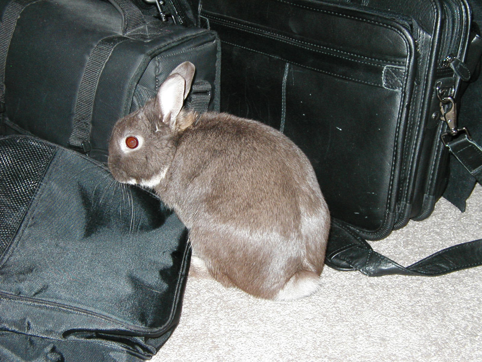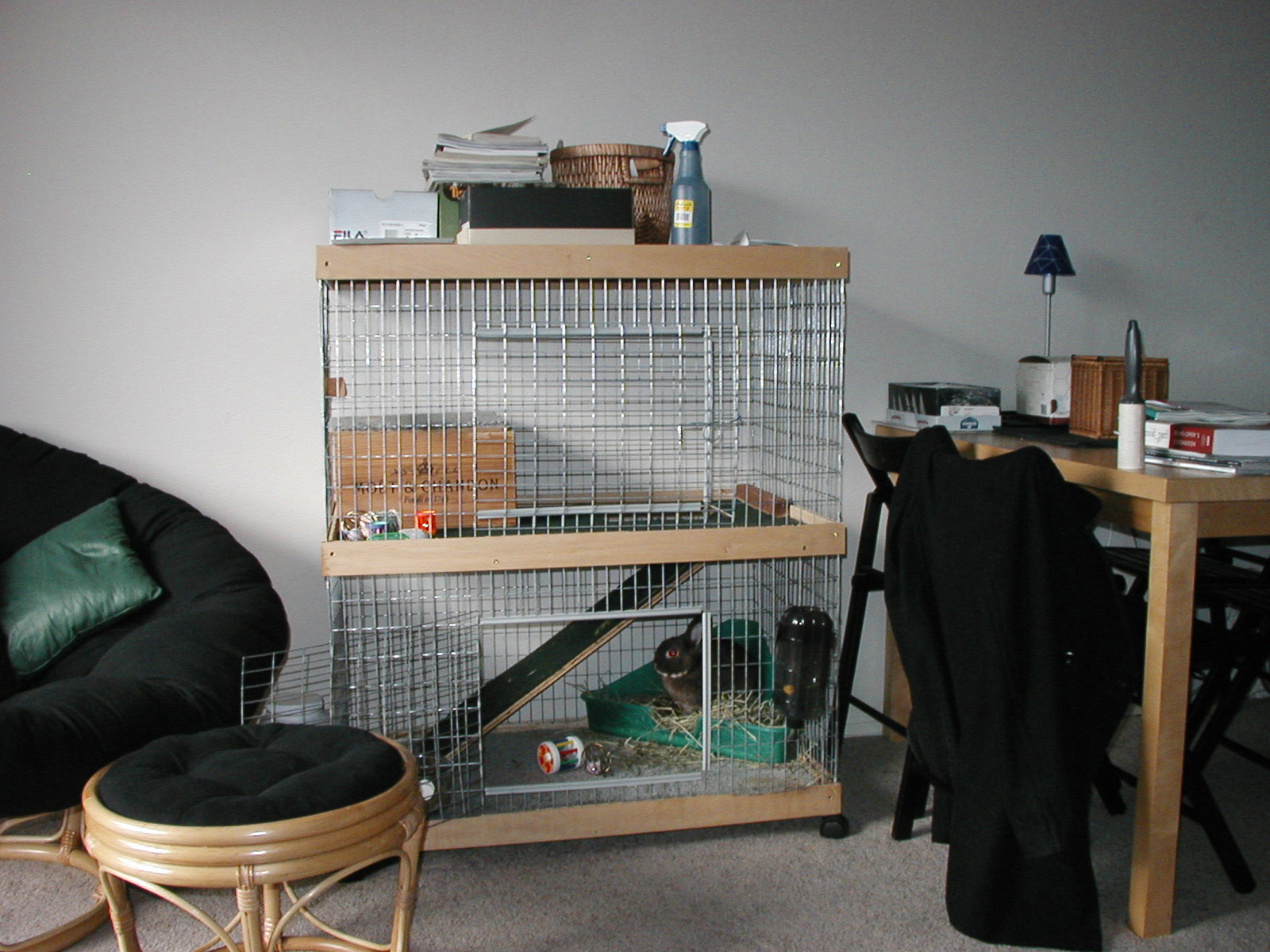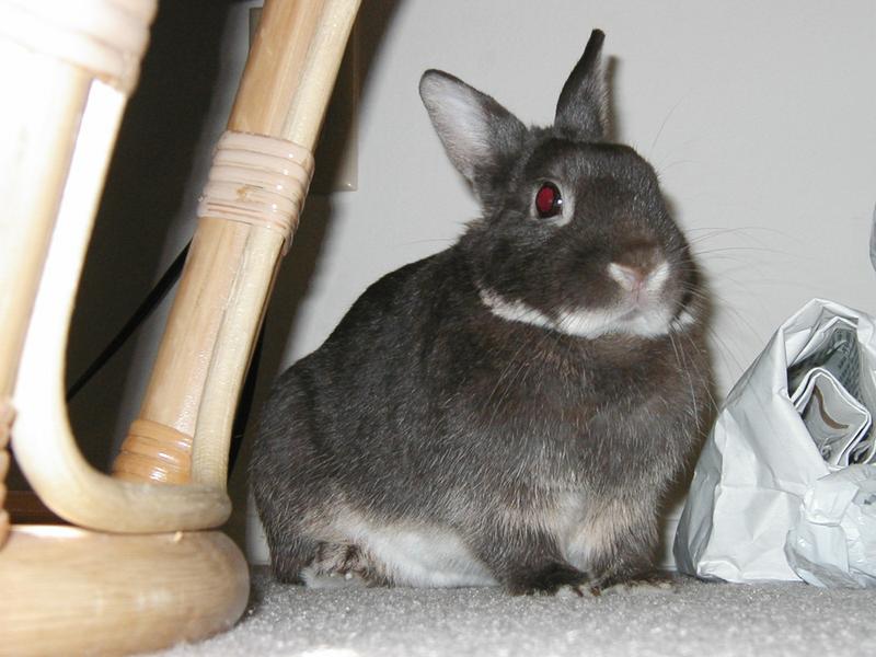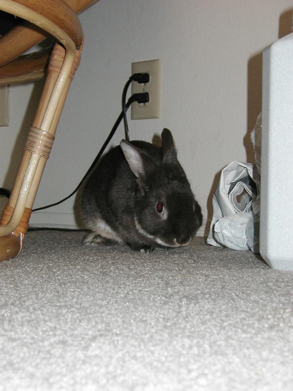 Neko PortraitsYou are here: Andrew Ho > Personal > Photos > Neko Neko was our bunny. He was a Netherlands dwarf rabbit. We bought him from a PetSmart in Chicago in summer of 1998. He was our first mammalian pet, and was our first and only lagomorph. He was a friendly but naughty house rabbit who lived in a fine two-story rabbit house from Leith Petwerks. His favorite food was Pepperidge Farm Bourdeaux cookies. He would chase you down if you had one. He also liked sweet biscuits and fruits of pretty much all kinds. As with most rabbits, he enjoyed ripe bananas and fresh greens. Neko was a very sweet rabbit, who loved nothing more than getting pet on the head and body, and would lick your nose as a reward. Neko got along with Zeus pretty well, and Zeus would often hang out sitting on Neko's box which we made from a Moët & Chandon champagne crate. Moy and Neko had a more tenuous relationship. Sometimes they sniffed noses, but other times they would chase each other.